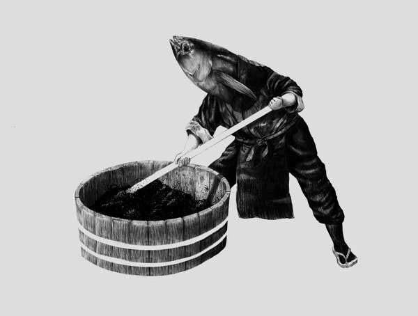 今天要为大家介绍的渔民米酒的特色包装设计,我们都知道渔民米酒里含有丰富的矿物质,其中包括能起到健康和美容的好处多酚,它是在年轻女性中流行的矿物质。今天要介绍的这个产品的名称就是指黑米。我们创建了一个身份,绘画的灵感来自渔业,它的包装设计由印尼艺术家精心设计的,细致幽雅的绘制插图,超现实主义的手法,代表着一个关于鱼贩子们酿造的意味深长的概念故事。